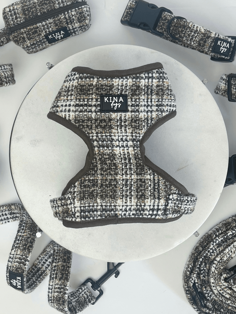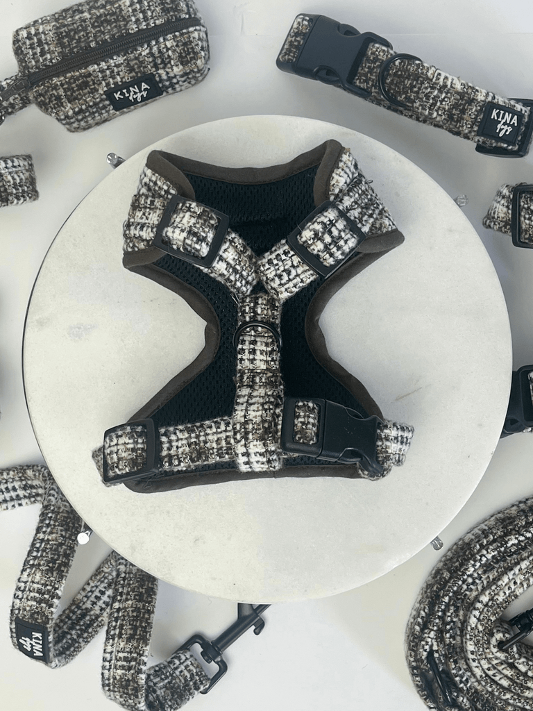 Colección clásica, sofisticada y atemporal. Inspirada en la elegancia del tejido tweed, esta colección combina estilo y confort para que tu perro luzca único en cada paseo. Con tonos neutros y textura acogedora, es la opción perfecta para quienes buscan un look distinguido, versátil y elegante que nunca pasa de moda.
